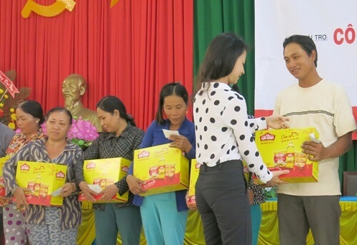Đại diện nhà tài trợ KIDO trao tặng các phần quà Đại Gia Đình và thẻ BHYT cho bà con