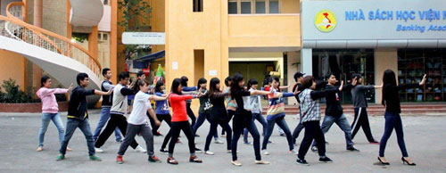 Đội Học viện Ngân Hàng khá chuyên nghiệp trong tiết mục flashmob.
