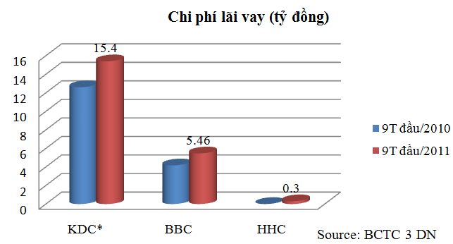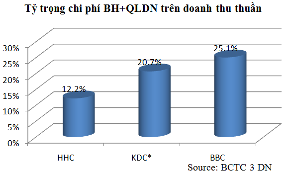 Tương tự với BBC, chi phí bán hàng trong 9 tháng đầu năm của KDC và HHC cũng tăng mạnh lần lượt ở mức 28,4% và 21% so với cùng kỳ năm 2010.
