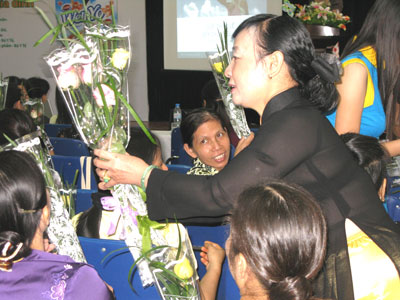 | Bà Minh Hà tặng hoa mừng cho chị em phụ nữ |