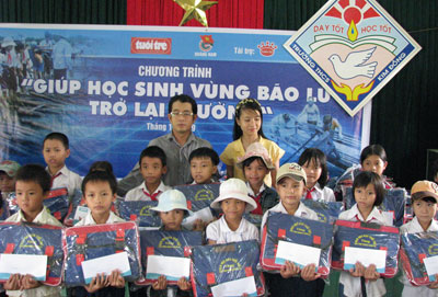 Buổi sáng 17.10, các em học sinh tại địa bàn của huyện Duy Xuyên đã có mặt để nhận phần quà do công ty Kinh Đô tài trợ, mỗi phần gồm 150.000 VND tiền mặt, 1 cặp học sinh, 10 cuốn tập và thước, viết trị giá khoảng 250.000 VND. Đây là những phần quà mà cán bộ công nhân viên công ty Kinh Đô đóng góp để giúp cho những em có hoàn cảnh khó khăn, bị ảnh hưởng nặng nề bởi đợt bão lũ vừa qua có cơ hội quay lại trường học và nhanh chóng hoàn tất chương trình của mình. Để đến được trường, nhiều em được bố mẹ đưa đến từ sáng sớm bởi đường đến trường khá xa và đường đi sau lũ vẫn bị bùn đất che lấp... Có mặt tại đây mới hiểu hết được sự háo hức chờ đợi của các em khi nhận những phần quà chia sẻ khó khăn từ các doanh nghiệp và nhà hảo tâm khắp cả nước.