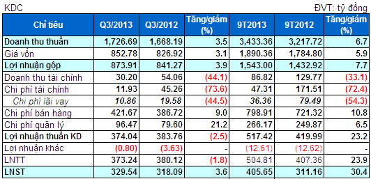 Cụ thể, doanh thu thuần trong kỳ của Tập đoàn đạt 3,433 tỷ đồng, tăng 7% so với 9 tháng đầu năm 2012. Trong khi đó, mức tăng giá vốn hàng bán là 6% giúp KDC thu về khoản lợi nhuận gộp 1,543 tỷ đồng, tăng 8% so với cùng kỳ năm trước. Tỷ suất lãi gộp của KDC ở mức 45%.