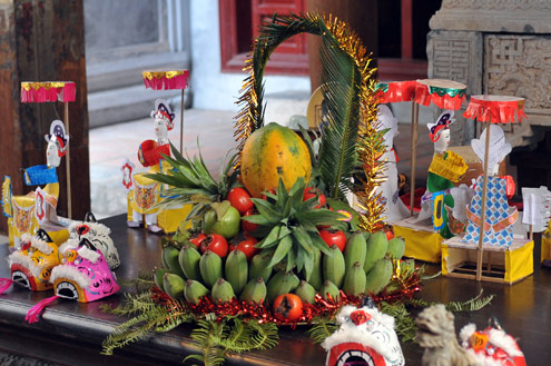 Mâm quả bày ban thờ đêm trăng rằm cũng được tái hiện ở đây. |