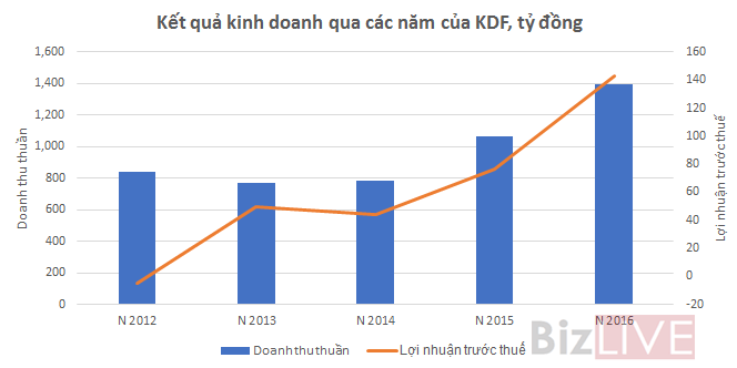 Thực tế cho thấy, năm 2012 chi phí đầu tư cho marketing và hệ thống phân phối, hệ thống hậu cần khá lớn đã ảnh hưởng đến lợi nhuận. Nhưng từ năm 2013 trở đi kết quả kinh doanh cải thiện, đặc biệt từ năm 2015 KDF ghi nhận mức tăng trưởng ấn tượng cả doanh thu và lợi nhuận.
