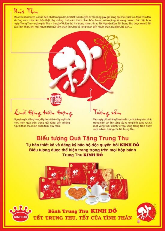 Nổi bật nhất trong năm nay, là biểu tượng Quà Tặng Trung Thu, được đưa vào tất cả các mẫu thiết kế bao bì sản phẩm bánh Trung Thu cùng các vật phẩm quảng bá của Kinh Đô. Nét chữ hoa chính trong biểu tượng mang ý nghĩa về Mùa Thu và vầng trăng tròn chính là biểu trưng cho ngày Tết Trung Thu. Tết Trung Thu được xem là Tết của Tình Thân, khi mọi người trao gởi tấm thân tình, lời cảm ơn đến người thân, gia đình, bè bạn…