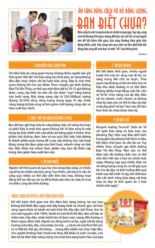 Bữa sáng là một trong ba bữa ăn chính trong ngày. Tuy vậy, sáng sớm là khoảng thời gian tương đối bận rộn với tất cả mọi người nên để tiết kiệm thời gian, bữa sáng thường được giản tiện bằng nhiều cách. Hãy cùng xem qua năm sai lầm phổ biến khi dùng bữa sáng để xem bạn có mắc “lỗi” nào không nhé