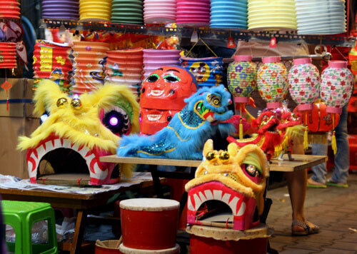Những chiếc đầu lân, sư tử bồi từ giấy với kích thước nhỏ đủ để trưng bày được bày bán trên phố.