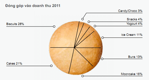 Đóp góp chính vào doanh thu của KDC là các sản phẩm bánh quy (biscuits), bánh bông lan (cakes) và Bánh trung thu (mooncake)